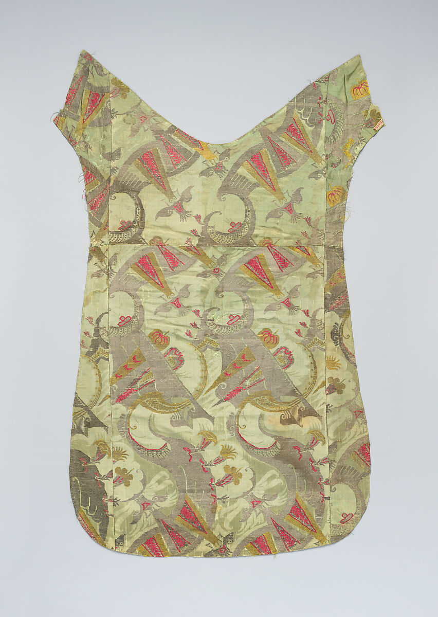 With its bold pattern, rendered in shades of sage green, hot pink, gold and silver, this is a fine example of the distinctive, early eighteenth-century figurative silks which, in the nineteenth century, were given the name "bizarre". This textile was apparently originally used in a different context, but has been carefully preserved, patched and reused in this current iteration as a garment to be worn by a Roman Catholic priest, a tabard-like chasuble.