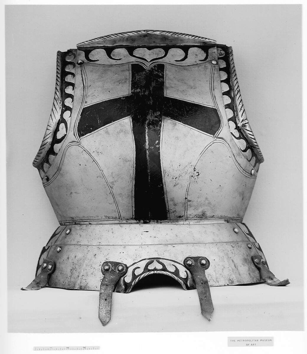- Dimensions:Helmet (08.261.10a): H. 17 1/2 in. (44.5 cm); W. 15 1/4 in. (38.7 cm); D. 8 3/4 in. (22.2 cm); Wt. 6 lb. 6.7 oz. (2911.5 g); each tasset (08.261.10b, c): H. 15 1/2 in. (39.4 cm)