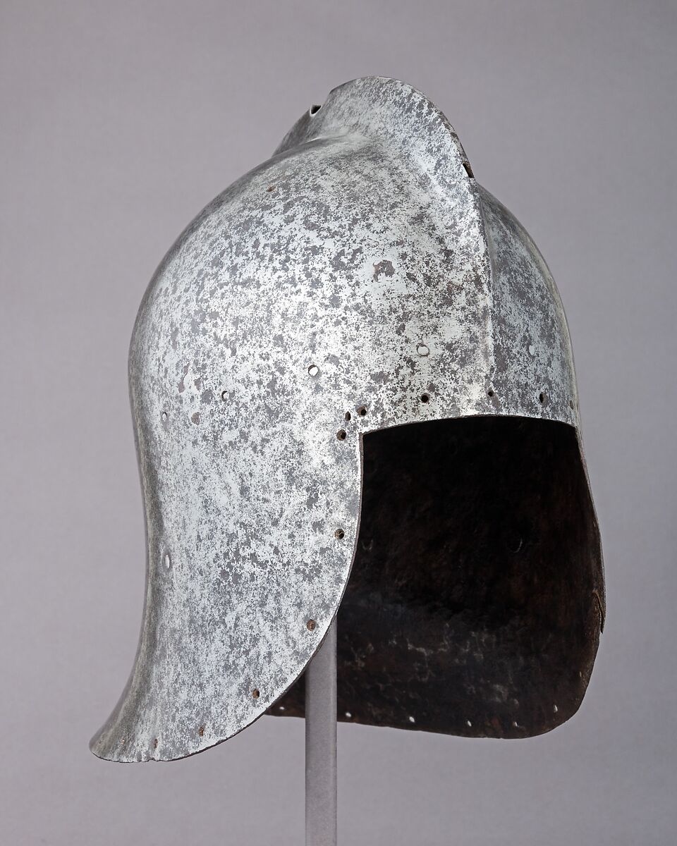 This type of sallet, with an open face and a long swept tail, was widely used by infantrymen in Italy. This example is stamped with armorer's marks attributed to Pietro Giacomo da Castello (documented 1485–1525), who worked for the dukes of Mantua.