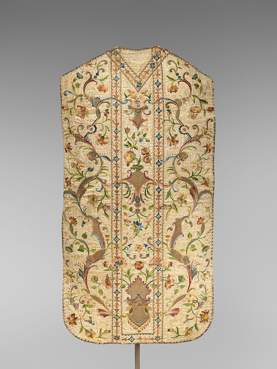 Well-executed in a glorious profusion of colorful silks, this liturgical garment- made for a Roman Catholic priest to wear when officiating at church services- was probably made by Chinese embroiderers, catering to the European market. Although the overall design responds to earlier Italian examples, motifs like the stylized and gilded lotus forms, the generous spacing of the floral elements and arabesques, and nuances of technique all suggest Asian execution. Although the garment seems at first glance to be composed of a decorated ground fabric with an applied orphrey strip down its center- as was conventional at this time- a closer look reveals the front and back are each made of a single piece of silk, over which the embroidery cleverly creates the illusion of three distinct panels.