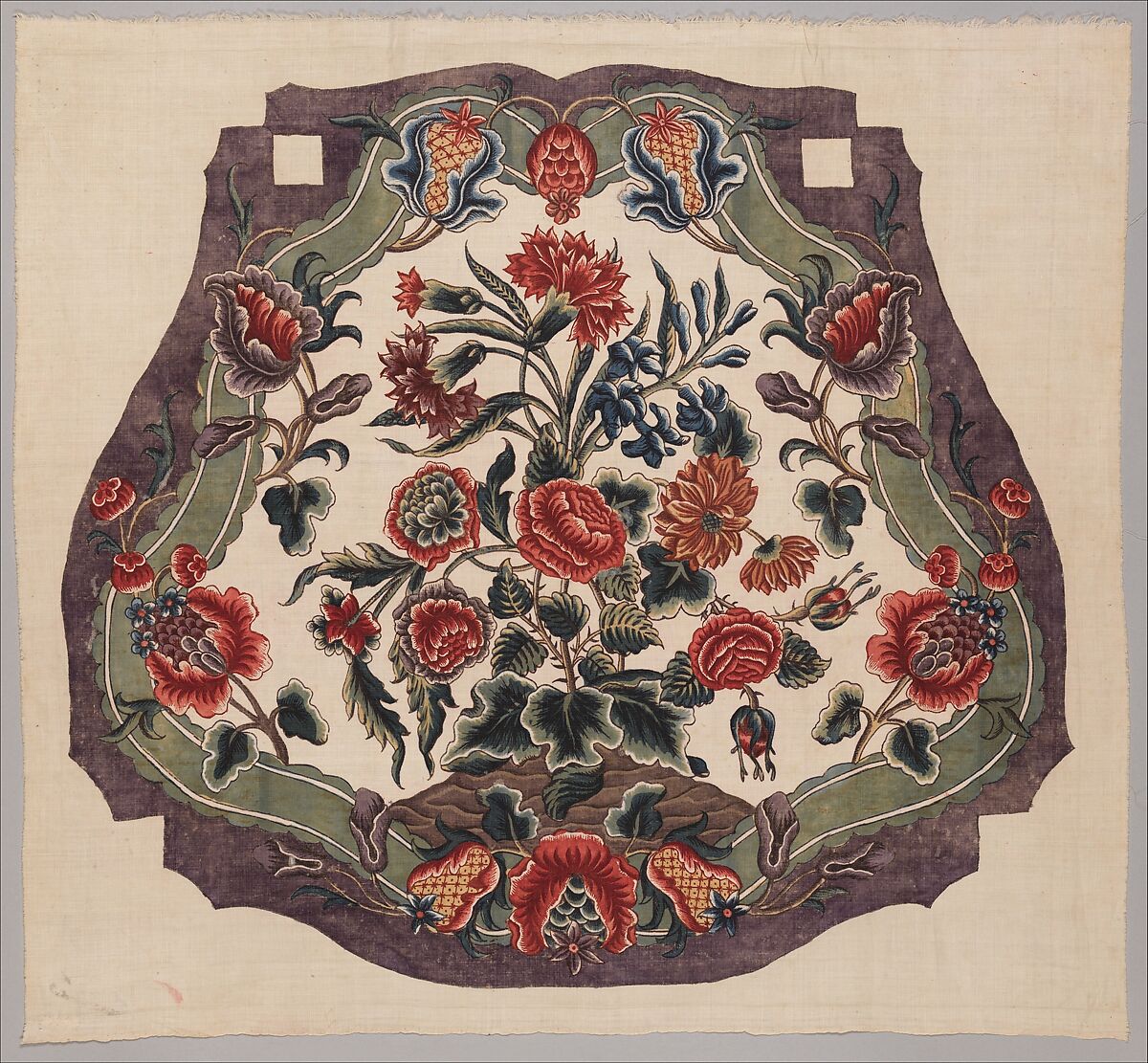 While the intended use of some Indian chintzes is difficult to determine, there can be no doubt that this panel was made to cover a European-style chair seat, although it was never used. The design’s overall shape indicates that it was created specifically for an English chair dating between about 1720 and 1740.[1]