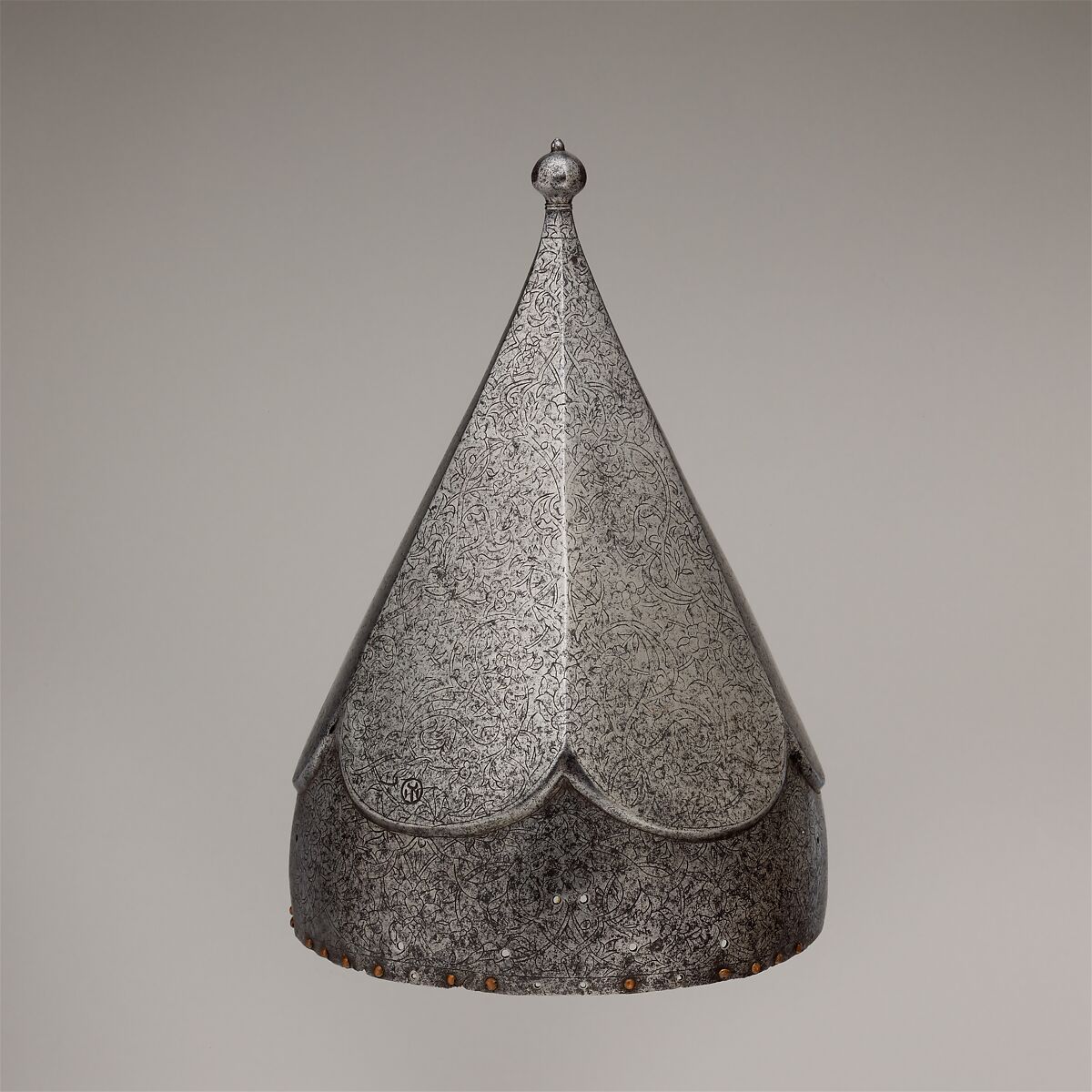 The decoration of split leaves and arabesques is found frequently on Ottoman ceramics and carpets of the mid-sixteenth century. Originally, the bowl had a brim with a sliding nasal, cheekpieces, and a neck guard. Two complete examples––one Mamluk (acc. no. 36.25.126), the other Ottoman (acc. no. 04.3.456a)––are also in the Museum's collection.