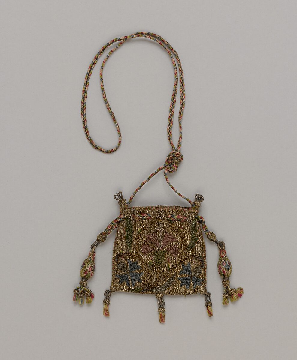 This elaborately embroidered purse probably corresponds to the "sweet bags" recorded in a number of sixteenth- and seventeenth-century inventories. The purse appears to have been worn around the person and to have carried scented herbs and essences to ward off the evil smells of daily life.
