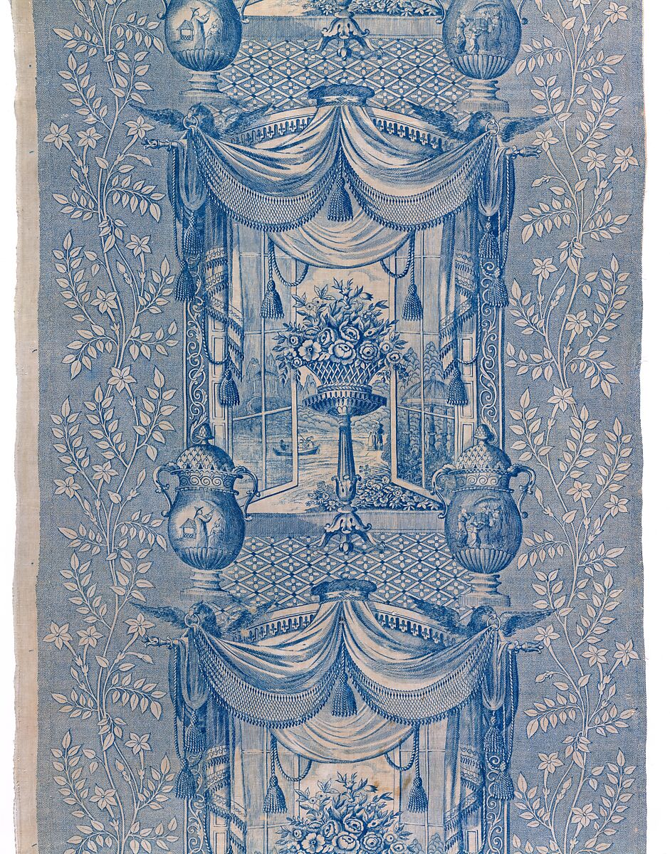 This roller-printed furnishing design was produced in at least three different single-color versions and one with multiple colors. The additional colors were added to the initial roller-printed design by block printing. The design relates to the "pillar" furnishing prints—patterns of fluted classical columns decorated with trailing vines and flowers—that enjoyed great popularity during the first third of the nineteenth century. The date of this piece is based in part on comparisons with window drapery styles that appeared in The Repository of Arts, Literature, Commerce, Manufactures, Fashions, and Politics in the years 1819 and 1820. The Repository of Arts was published in London by Rudolph Ackermann (1764–1834) between 1809 and 1828, and vividly documents the taste of the English Regency.