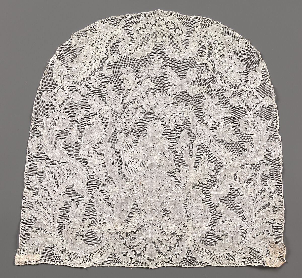 This cap crown is unusual for its depiction of a character from classical mythology—Orpheus, playing his lyre to charm the birds and animals around him. This type of bobbin lace is called Mechlin, so named for the town where it was made. It is a straight lace, meaning the motifs are made at the same time as the background mesh (in this case, hexagonal), with a thicker thread of shiny linen defining the motifs. This piece was made in three lengths, each using more than five hundred thread-wound bobbins. The strips are cleverly joined in an irregular path around motifs, avoiding joins in the mesh, which are hard to conceal. Strips of straight lace are only limited in width by the number of bobbins that can fit on a lace pillow.