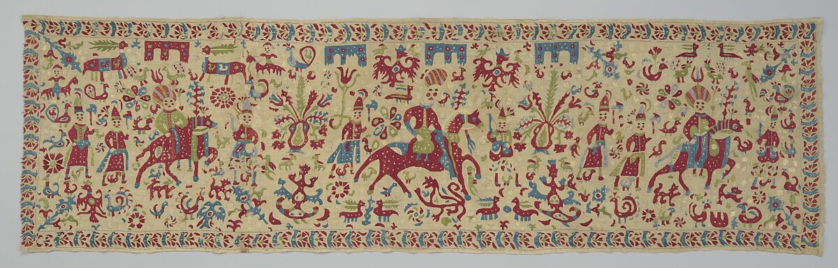 Epirus was an important textile production center in the Balkans. Commercial embroidery made there in great volume for distribution throughout much of the Ottoman empire represents a mainland tradition. But Epirus was also the source of domestic embroideries that are similar to Aegean work. This bolster cover from Epirus is closely related to Greek island embroideries. Featuring three groups of horsemen and attendants amid small-scale birds, animals, vases of flowers, and double-arched structures, the cover was part of the furnishings for a bed or sofa.