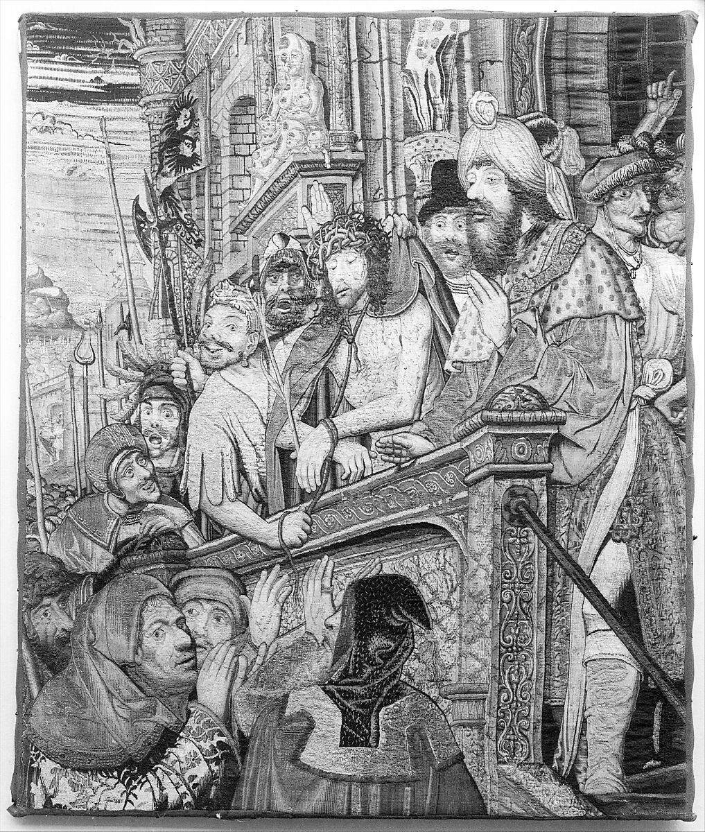 As such, this is one of a sizeable group of smaller-scale devotional tapestries (like 06.301 also at The Met) produced by talented weavers almost certainly working in Brussels- the center of excellence for figurative tapestry weaving throughout the later fifteenth and the sixteenth centuries- probably made on speculation for sale on the open market. Representing the scene recounted in the Biblical book of John, 19:5, when the Roman governor, Pontius Pilate, showed the arrested Christ to the people, mockingly crowned with thorns, just before his execution, this subject matter was ideal for the tapestry’s privileged owner to contemplate and use as a devotional tool, meditating on the narrative of Christ’s sacrifice.