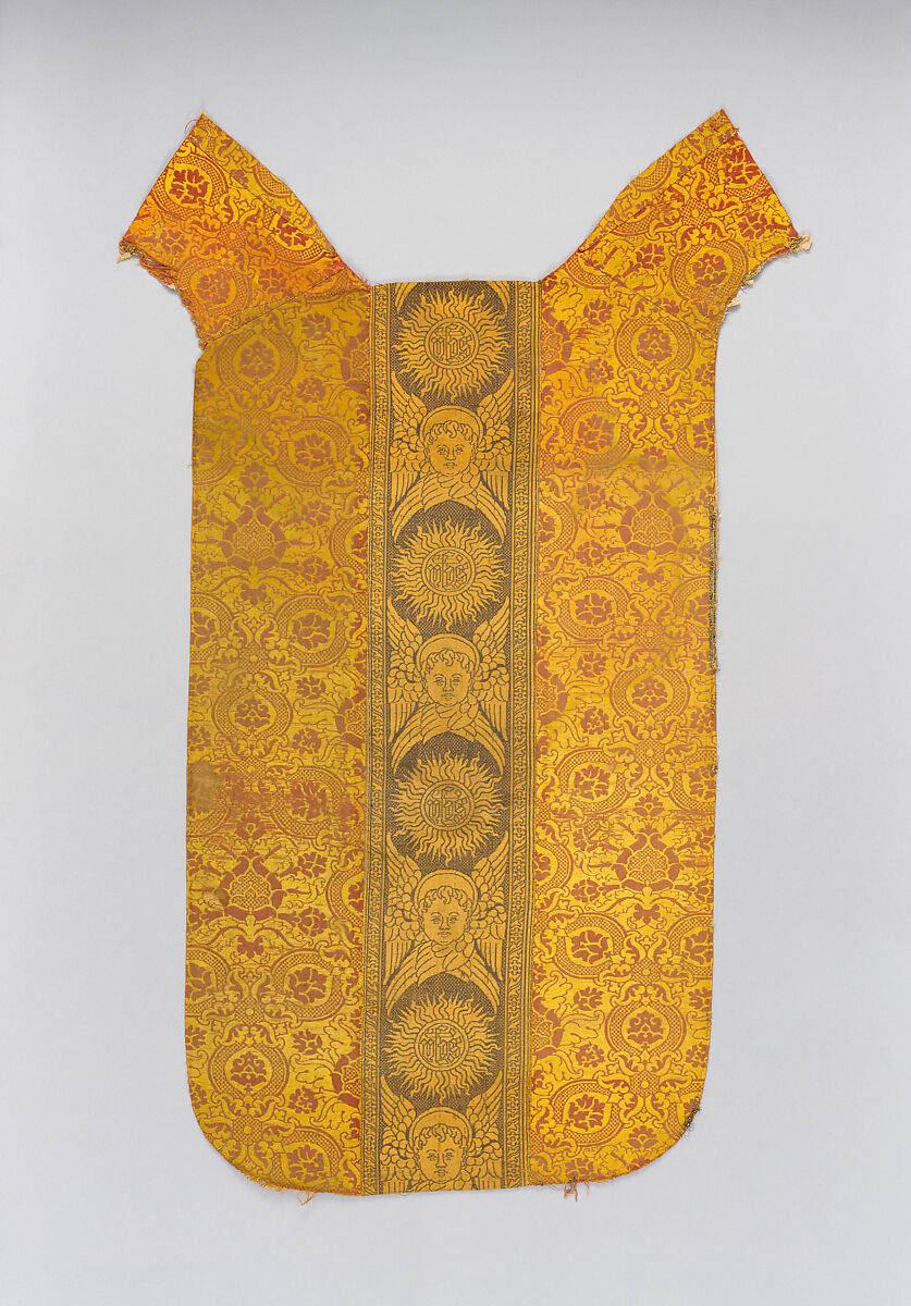 Although this object resembles the reverse of a chasuble– the tabard-like garment worn by a Catholic priest during church services– this is a modern composite of a central, figurative, woven orphrey strip (33.39.7) with two lengths of lampas silk (33.39.8a, .8b), assembled soon after the three elements entered The Met's collection in 1933.