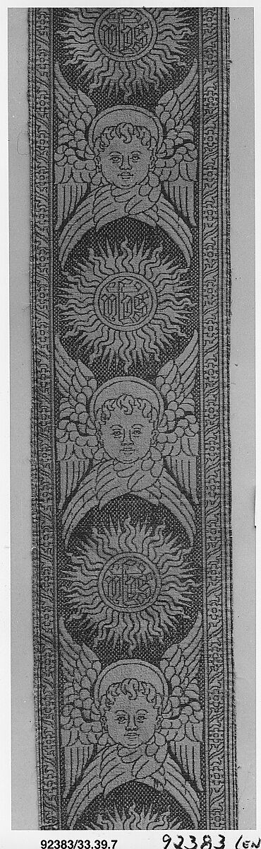 - Title: Orphrey woven with figurative repeat design of seraphim with IHS Christogram in glories