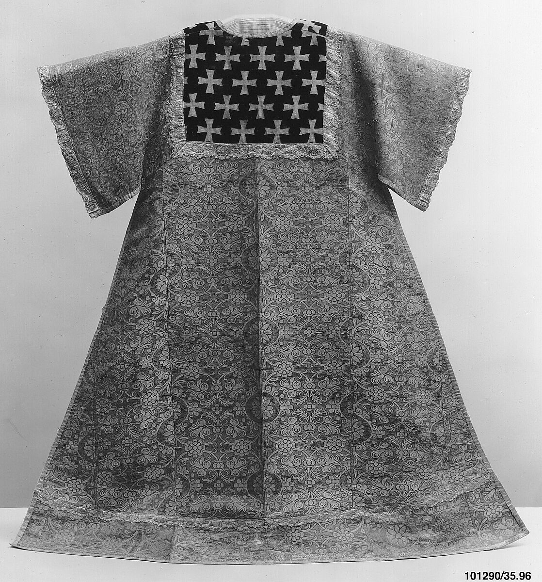 The crosses being badges of the knights of Malta, it is probable that the dalmatic was originally worn in a priory or commandery of that order in Spain.