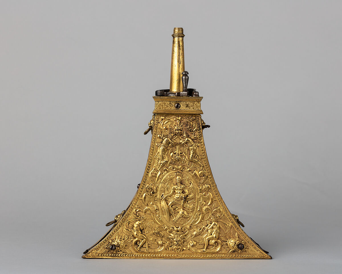 The decoration of the front panel combines motifs from French and Flemish ornament prints. The figure in the central oval represents Mars or another personification of war.