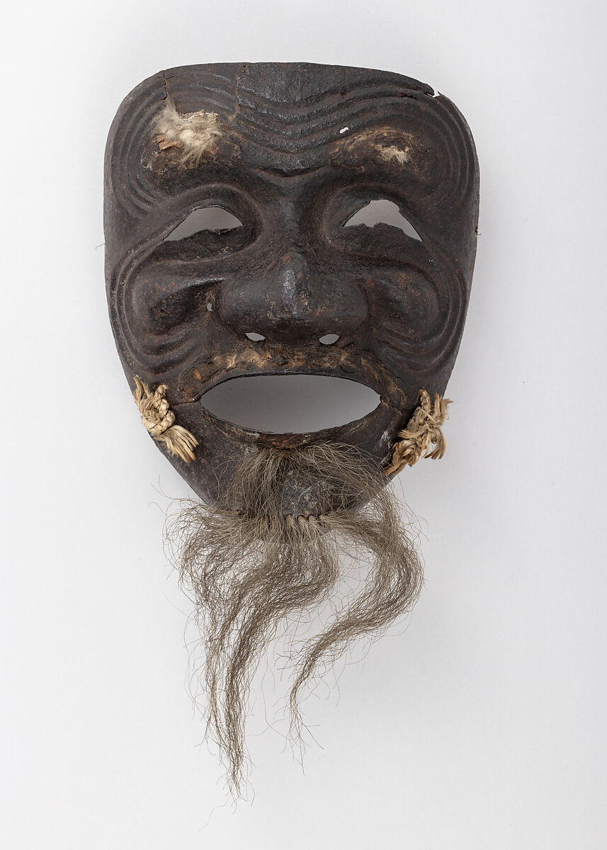 This is one of the earliest surviving examples of a full face mask (somen). It is also very rare for being modeled on a specific character from Noh drama: the happy old man (okina) with distinctive white eyebrows and beard.