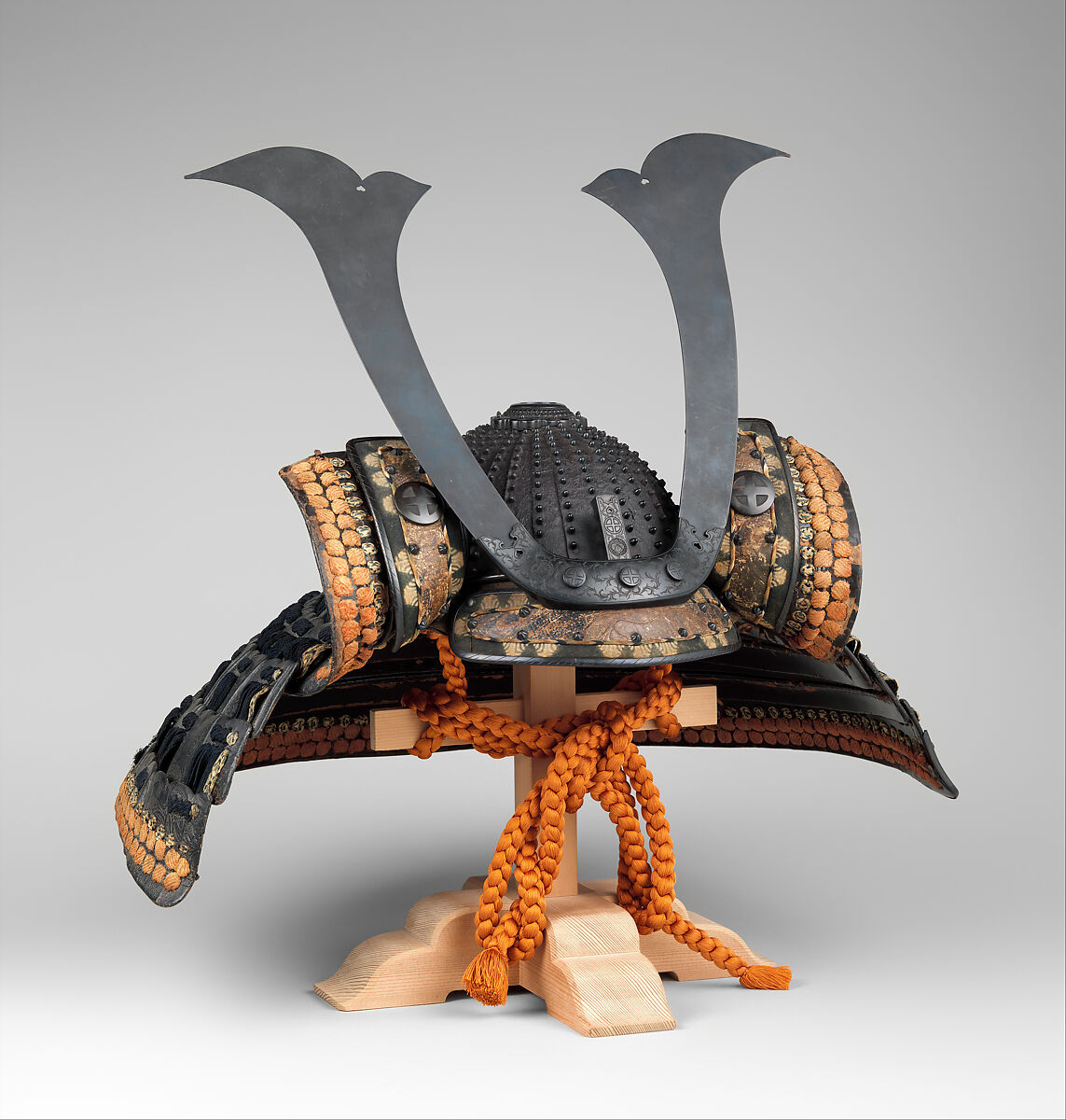 The helmet bowl, constructed of thirty-two iron plates, dates from the fourteenth century but was remounted for use in the eighteenth century. The metal fittings on the turnbacks of the neck guard include the badge (a cross within a circle) of the Shimazu family, daimyo of Kagoshima.