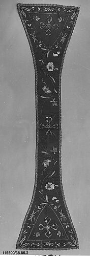 Of modest design and execution, this is part of a larger set of vestments (38.86.1-.5) likely made and decorated in China for export to Europe. The set is dominated by the sage green palette of the light silk ground material. The floral motifs are embroidered with colorful- but very thin- silk threads, resulting in some losses exposing the rudimentary underdrawings. Originally, the surfaces would have been decorated with spangles and sequins, most of which have been lost.