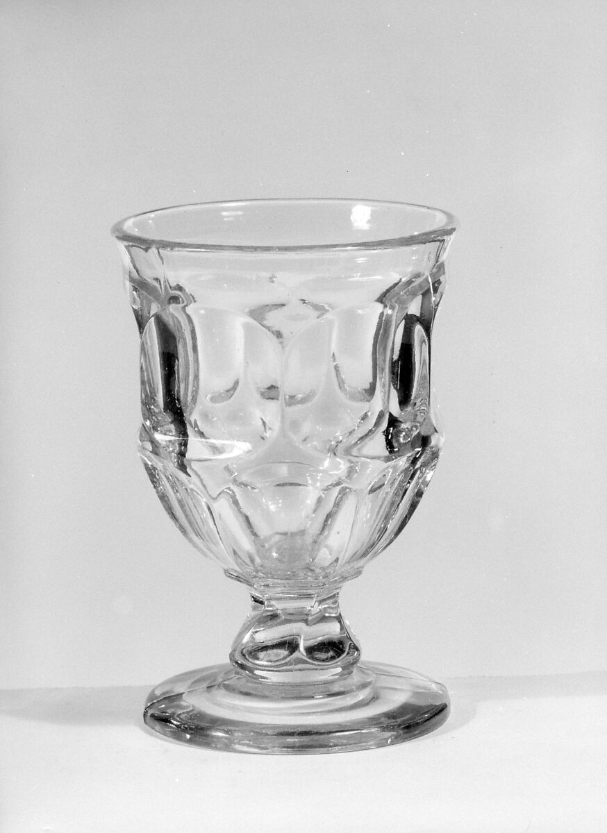 With the development of new formulas and techniques, glass-pressing technology had improved markedly by the late 1840s. By this time, pressed tablewares were being produced in large matching sets and innumerable forms. During the mid-1850s, colorless glass and simple geometric patterns dominated. Catering to the demand for moderately-priced dining wares, the glass industry in the United States expanded widely, and numerous factories supplied less expensive pressed glassware to the growing market. At the Exhibition of the Industry of All Nations at New York’s Crystal Palace in 1853, for example, the New England Glass Company exhibited 130 pieces of one design, "consisting of bowls, tumblers, champagnes, wines, and jelly glasses." This object belongs to one such service. Although the glass manufactory is not known, the glassware is very typical of the large services that were very popular with America’s middle class in the nineteenth century.