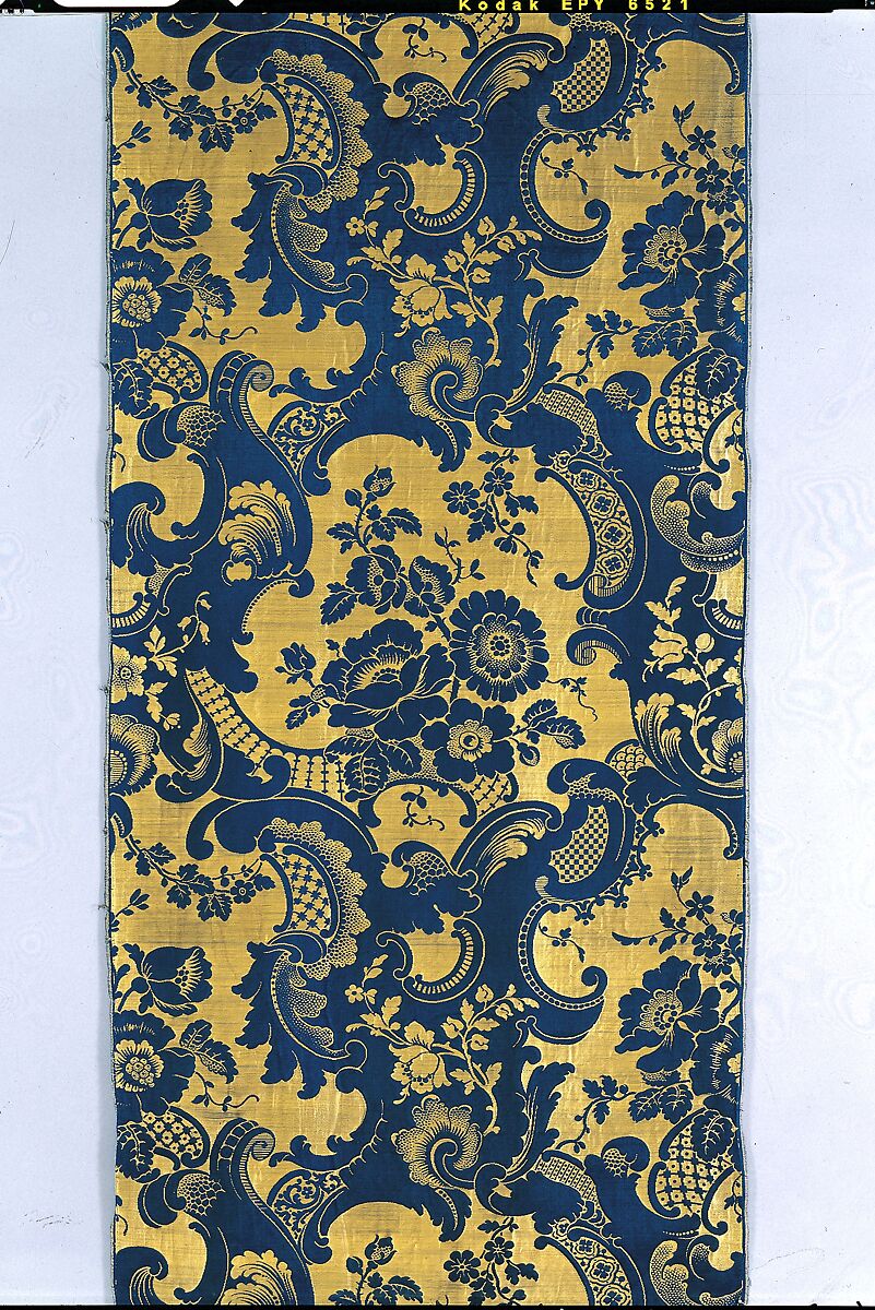 This furnishing textile epitomizes Rococo Revival textiles, with flowers enclosed in asymmetrical cartouches comprised of """ and "S" scrolls. Mid-eighteenth-century Rococo textiles did not make use of the cartouche in this way; this motif has been lifted from other eighteenth-century art forms such as furniture, carved wall panels (boiserie), and silver. Revival styles were particularly popular in the United States, and French textiles were frequently imported for use in upper-class American homes of the mid-nineteenth century. The carpet in the Museum's Rococo Revival Parlor displays a similar combination of asymmetrical scrolls and floral bouquets.