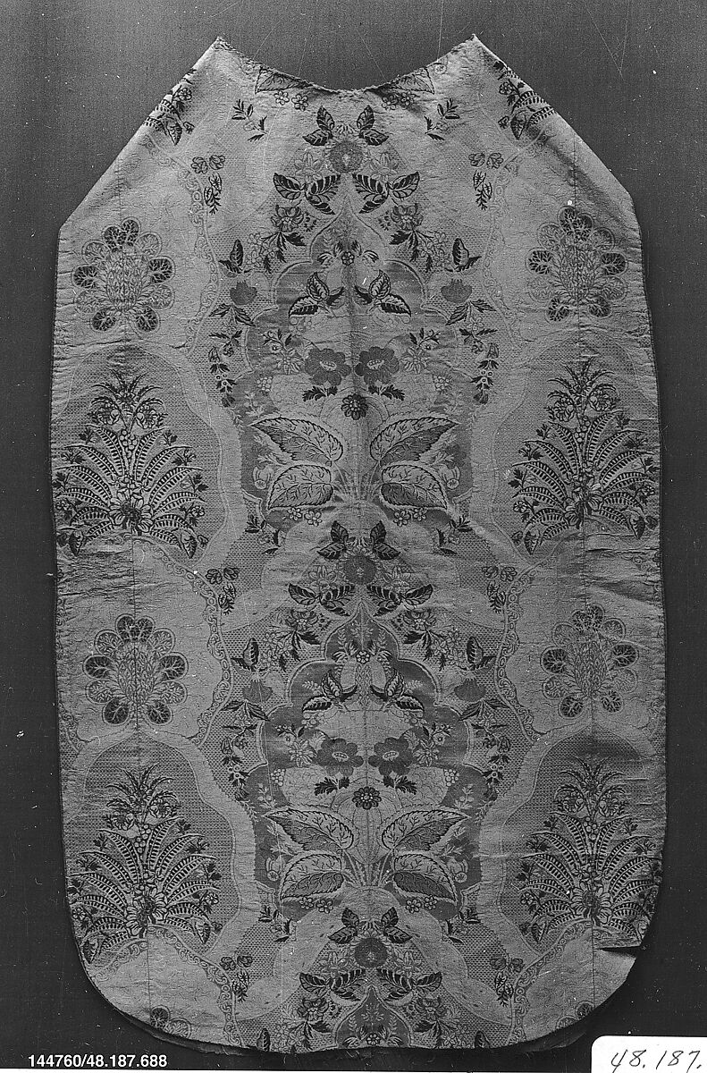 This modest chasuble– the tabard-like garment worn by a Roman Catholic priest over the alb and other clothing whilst leading services in church– exemplifies middle-range eighteenth-century production. It was tailored from a mass-produced, but appealing, satin in which multiple supplementary wefts create a floral pattern in a palette of green, pink and blue against a white ground articulated by mat and glossy white silk. At some point, probably during the nineteenth century, the chasuble, doubtless exhibiting multiple signs of wear-and-tear, underwent an intensive restoration campaign, in which another machine-woven floral textile was used to patch holes around the chest area, and during which the chasuble’s front was cut to a more fashionable, fiddle-back silhouette.