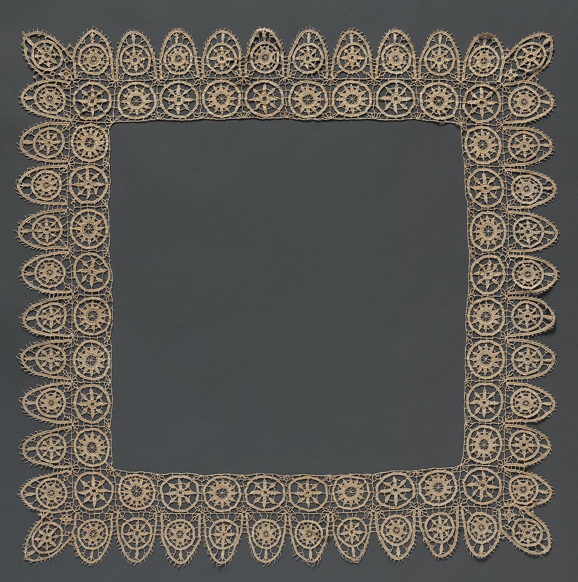 Punto in aria—literally, "stitches in the air"—is one of the earliest styles of needle lace, which is itself developed from cutwork of primarily geometric design. When lacemakers transitioned to using a foundation of threads laid out according to a pattern drawn on parchment, they were able to incorporate more fluid lines and curves into their designs.