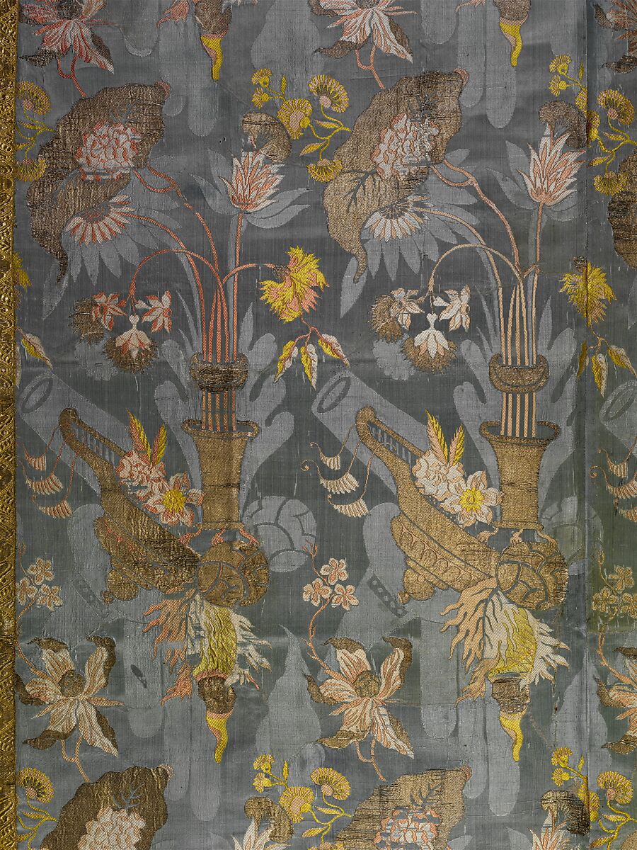 Panels such as this—with its extraordinary patterns in long repeats—were called "bizarre" by the Danish scholar Slomann, who believed they were made in India. Most scholars consider them an exotic phase in the history of European silk weaving.