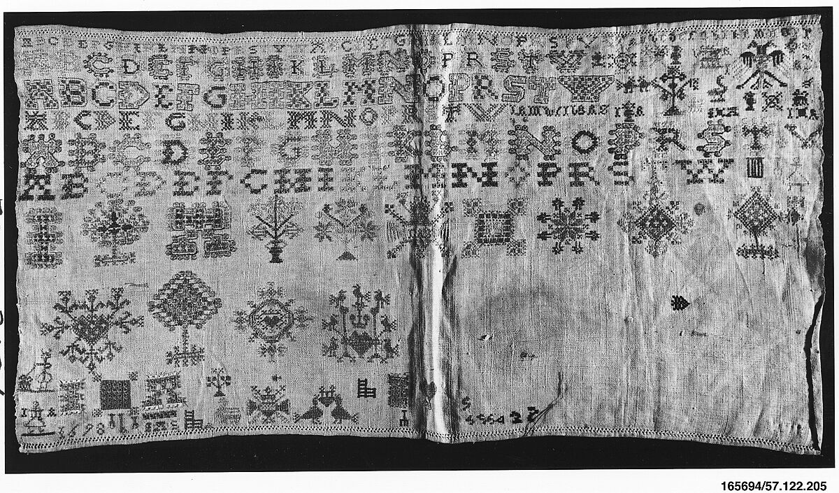 Samplers from Friesland, in the northwest of the Netherlands, are characterized chiefly by many alphabets and a tree of life motif. The work is dotted with domestic scenes and symbols, including a man walking a dog and several women positioned near or using tools, in addition to gardening tools, chairs, vases, and sewing pillows. The letters IA and IAS (or JA and JAS, as "I" and "J" were written interchangeably in the Latin alphabet at this time) and the year 1698 are stitched onto the linen, most likely the initials of the maker and the year in which she completed her work.