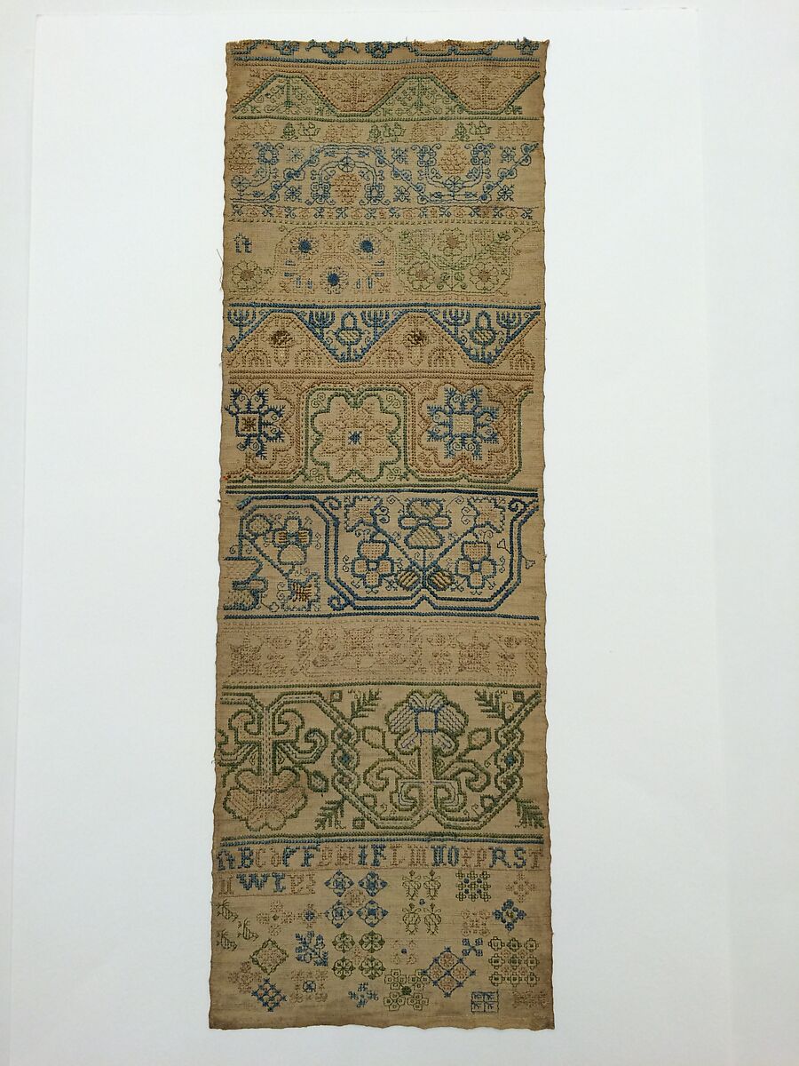 Band samplers are composed of horizontal rows ("bands") of embroidered patterns stitched along the linen foundation fabric. Many of the patterns stitched onto band can be traced to sixteenth-century pattern books, and often include depictions of fruit, flowers, and geometric patterns. This sampler is made up of bands of varying heights that feature birds, acorns, pineapples, and a variety of flowers. The bottom of the sampler includes an alphabet consisting of a mix of uppercase and lowercase letters and small, seemingly randomly placed motifs, resembling a spot sampler.