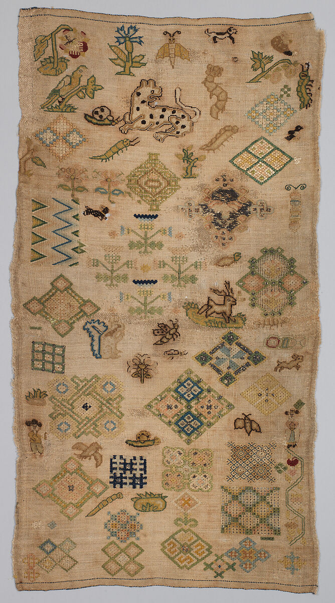 Spot samplers feature motifs that are scattered in a seemingly random fashion over the surface of the foundation fabric, usually linen. These samplers are rarely signed or dated, and often include motifs that are only partially worked, leading to the conclusion that this type of sampler was made as a personal stitch reference for its maker, and not for display, as band samplers were signed by student embroiderers. In addition to geometric designs that are of the type that would have been used to decorate small purses, cushions, and other accessories, the sampler includes "slips," motifs that would have been worked in tent stitch and then cut out and appliqued onto larger pieces of work that would have been too large and unwieldy to embroider on their own. On this sampler, these motifs include flowers, caterpillars, birds, and dogs, as well as a leopard, stag, and squirrel.