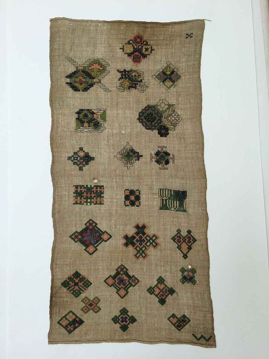 Spot samplers feature motifs that are scattered in a seemingly random fashion over the surface of the foundation fabric, usually linen. These samplers are rarely signed or dated, and often include motifs that are only partially worked, leading to the conclusion that this type of sampler was made as a personal stitch reference for its maker, and not for display, as band samplers were signed by student embroiderers. The sampler features geometric spots, many of which are worked as diaper patterns (a pattern that has a regular repeat in all directions). The spots are stitched primarily of green and metal threads.