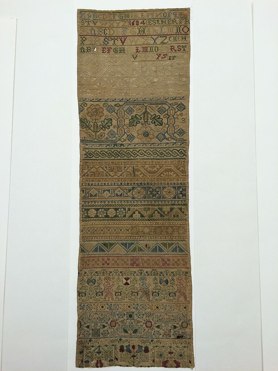 Included on the sampler is the name Esther French and the year 1684, presumably the name of the maker and the year in which she completed her work. She may have been Esther French (sometimes written as "Hester") of Warminster, Wiltshire, England, who was born on November 25, 1670. This would make her thirteen or fourteen years old when she completed her sampler. Esther was born into a family of clothiers (professionals who make or sellcloth) and married into the Wansey family, another family of clothiers in Warminster.
