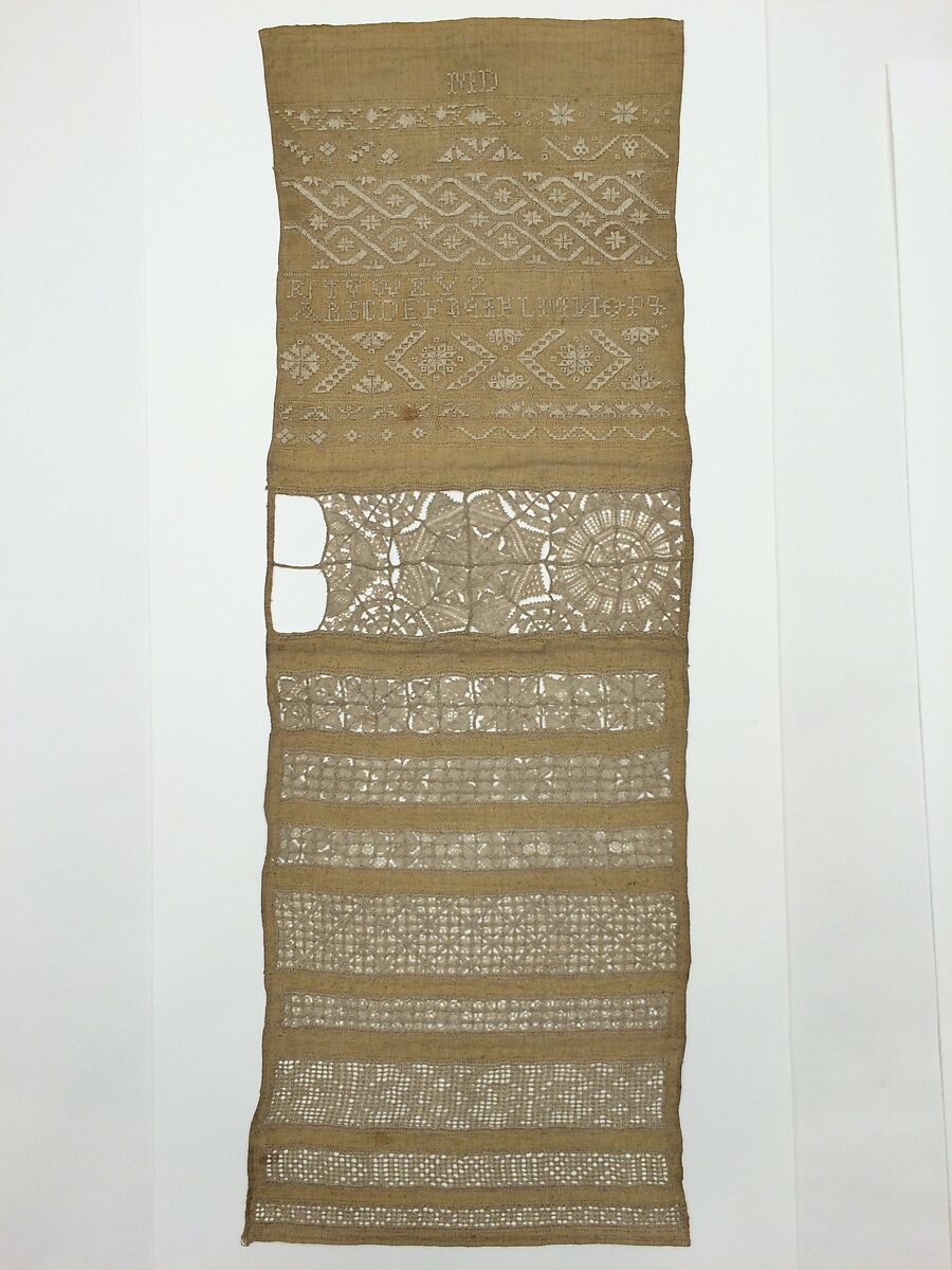 This sampler is worked in whitework and reticella, which requires a stitcher to remove warp and weft threads from a piece of fabric before stabilizing the fabric with buttonhole stitches and creating designs based on the grid of the linen. The top of the sampler, worked in satin, eye, and line stitches, features the initials "MD" (presumably the initials of the maker) and an alphabet, along with geometric and stylized floral patterns of varying length. The remainder of the sampler consists of cutwork filled with reticella lace in geometric patterns.