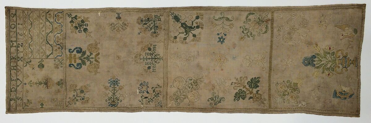 This long and narrow sampler is divided up into five square sections, two small and three large, on top of which is an alphabet. Four of the squares consist of floral motifs along the borders and facing the middle, while the fifth features banded geometric patterns. The letters SM and the year 1651 are stitched onto the linen, most likely the initials of the maker and the year in which she completed her work. Flanking these initials are a ship’s wheel and an unidentified animal.