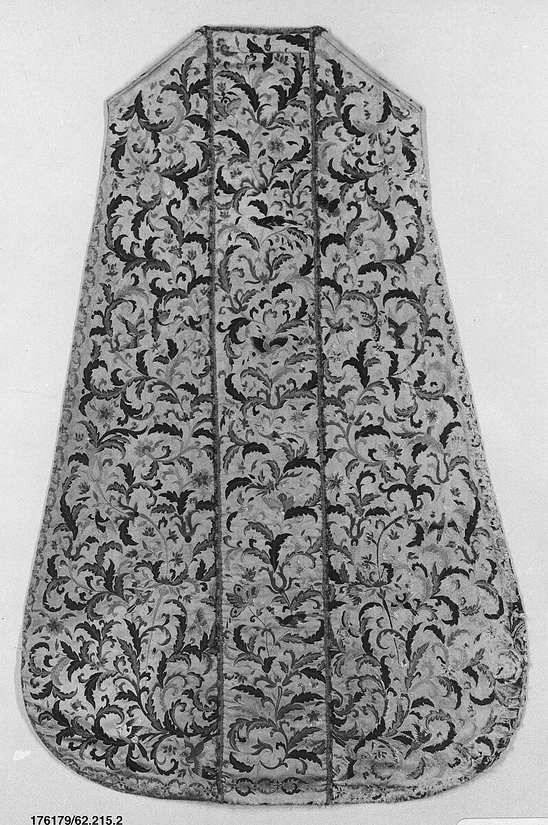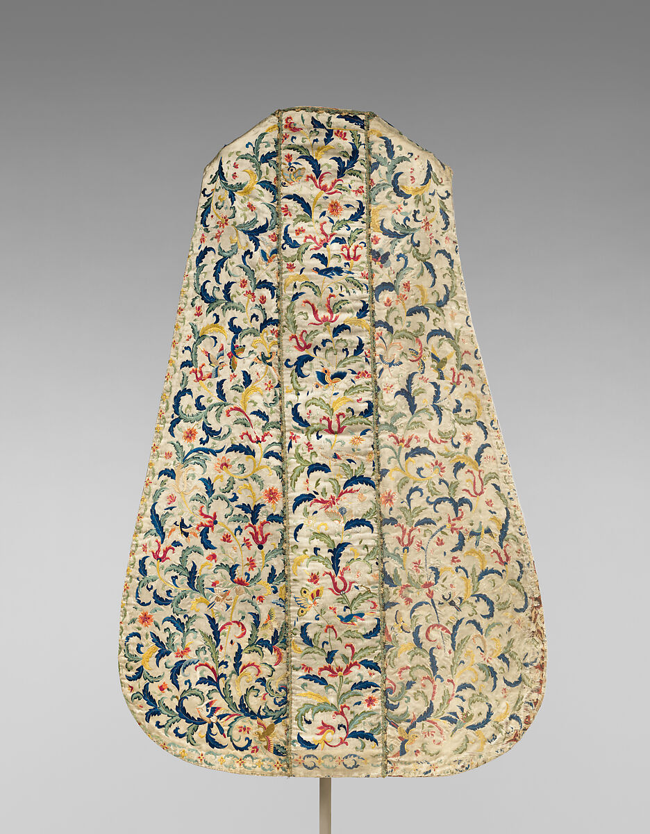 This garment– a tabard-like Chasuble, intended to be worn by a Catholic priest– is an early example of what would become an increasingly lively export market of Chinese embroidered needlework to Europe. The brilliant palette, combining yellow, green, red, orange and deep blue, and delicate patterning of birds within foliage is very representative of the Asian needlework most prized in Europe. Indeed, the decoration of this chasuble closely resembles another within The Met's collection (1973.118a). This piece, however, has been tailored in the conventional European style, with each face of the chasuble constructed out of three panels of textile, whereas 1973.118a– like most surviving Chinese chasubles for the European market– is composed of a single length of embroidered silk, patterned to look as if it consists of multiple pieces.