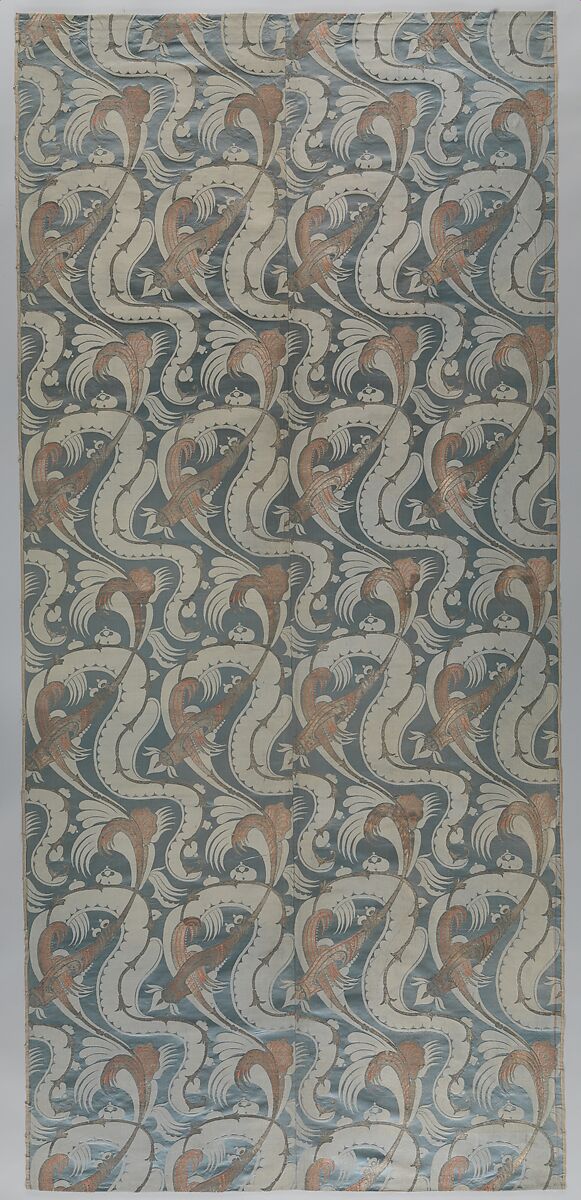The high quality of this particular example and others of the type suggests that these textiles were made in well-established European weaving centers, such as Lyon or Tours in France, in Venice, or in other Italian or Spanish textile-producing cities. A small number of them have been associated with the Spitalfields weaving center (now in the East End of London) on the basis of the extant design drawings by several early eighteenth-century English designers.[3] The Dutch are known to have had a significant silk-weaving industry as well (see MMA 1976.12), and some Dutch examples of bizarre silk from the early eighteenth century have been identified.[4]