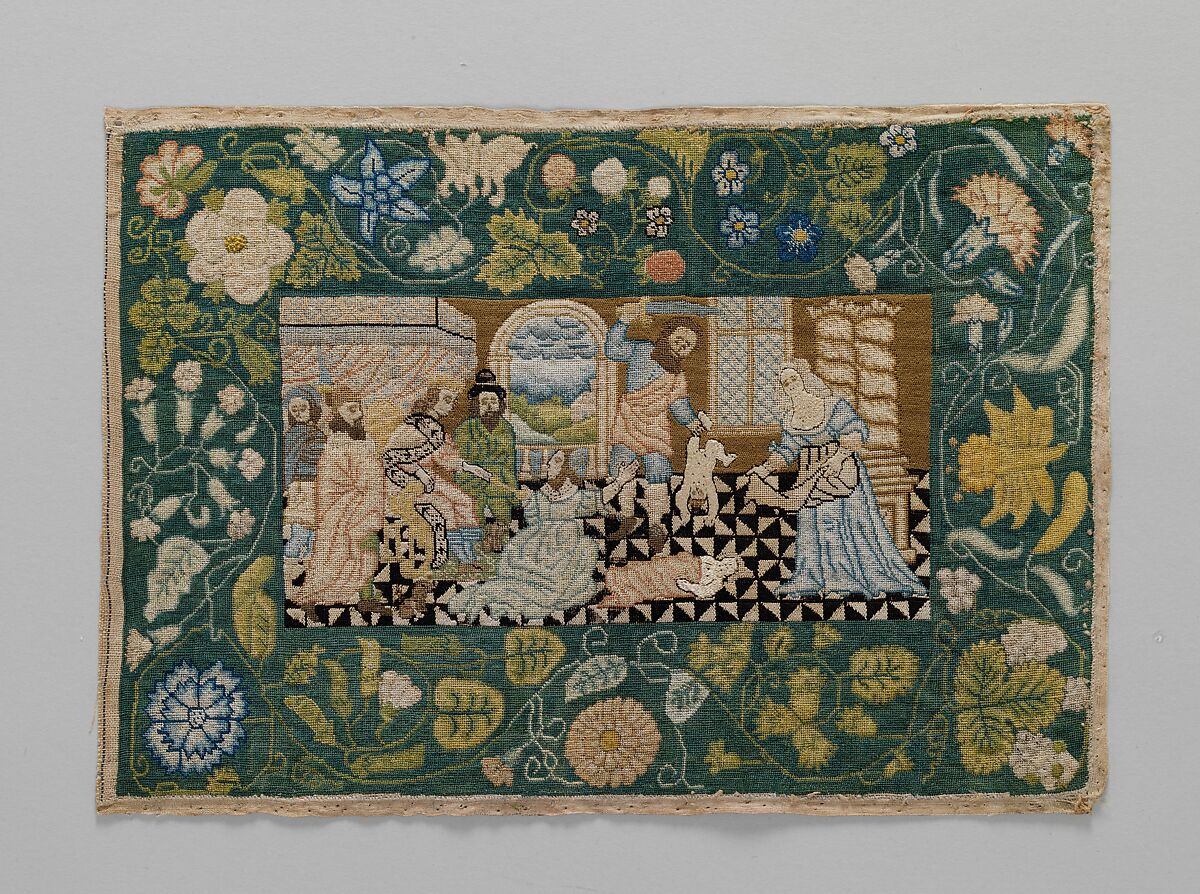 - Medium: Canvas worked with silk thread; tent, knot, split, and steel stitches