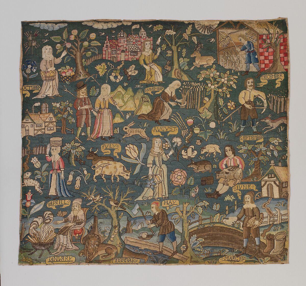 Figurative scenes rendered in needlework were popular in English Renaissance homes; these textiles often functioned as cushion covers or table and cupboard carpets. A talented female amateur likely sewed this piece using a professionally prepared kit with the design outlined in advance on canvas. Here, a circuitous path leads through each month’s activities. Some of the figures are at rest, but most are at work, reflecting the realities of seventeenth-century British rural life.