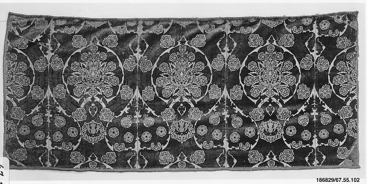 A great ornamental development of the ancient palmette motif was inseparably linked in the fifteenth and sixteenth centuries in Spain and Italy with the development of patterned velvet weaving. This particularly magnificent example of the combination appears also in a cope at the Hispanic Society.