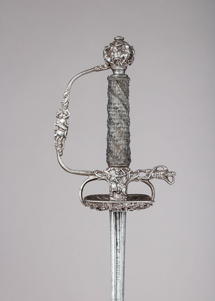 By the early seventeenth century, the rapier, a long slender thrusting sword, began to dominate as the gentleman’s weapon of choice. During the course of the century, however, as civilian fencing techniques became more specialized and refined, the rapier developed into a lighter, trimmed-down weapon known by about 1700 as the smallsword. Smallswords, often richly decorated, remained an integral part of a gentleman’s wardrobe until the wearing of swords in civilian settings went out of fashion at the end of the eighteenth century, at which time pistols were replacing swords as arms most frequently used in personal duels. The majority of smallsword hilts are made of silver or steel, but many also employ a wide variety of luxurious materials, such as gold, porcelain, and enamel. At their best, smallswords combine the crafts of swordsmith, cutler, and jeweler to create an elegant weapon that was also a wearable work of art.