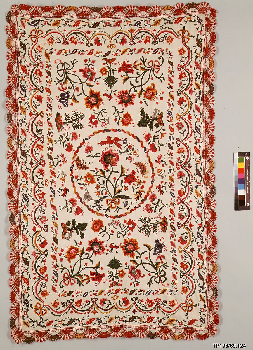 - Medium: Wool, sequins, metal thread, on cotton ground