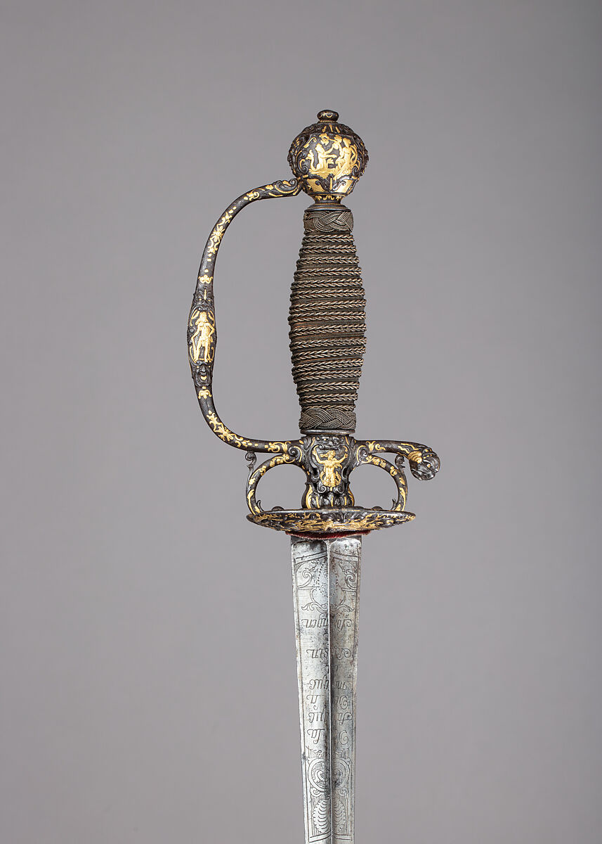 By the early seventeenth century, the rapier, a long slender thrusting sword, began to dominate as the gentleman’s weapon of choice. During the course of the century, however, as civilian fencing techniques became more specialized and refined, the rapier developed into a lighter, trimmed-down weapon known by about 1700 as the smallsword. Smallswords, often richly decorated, remained an integral part of a gentleman’s wardrobe until the wearing of swords in civilian settings went out of fashion at the end of the eighteenth century, at which time pistols were replacing swords as arms most frequently used in personal duels. The majority of smallsword hilts are made of silver or steel, but many also employ a wide variety of luxurious materials, such as gold, porcelain, and enamel. At their best, smallswords combine the crafts of swordsmith, cutler, and jeweler to create an elegant weapon that was also a wearable work of art.