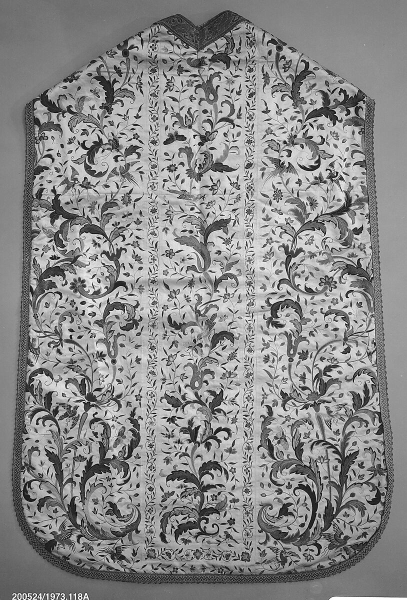 Eighteenth-century Europeans were entranced by the light touch and vibrant palettes of Chinese embroidery, worked upon soft, lustrous Chinese silks. This chasuble– the tabard-like garment worn by a Catholic priest in Christian church services– is part of a partially-surviving set of church vestments in The Met's collection (see 1973.118b, .118c, .118d). The complete set was decorated and assembled in China for the export market; although the front and back of the chasuble were each made in a single piece, the chasuble's Chinese designers evoked the European convention of sewing together separate side panels and central "orphrey" strips. At some point in its history, the chasuble needed considerable repairs after the wear-and-tear of decades' use worn by priests: patches cut from a matching item in the vestment set were very carefully applied to the garment's front around the chest area, the seams and joins hidden by a broad, nineteenth-century passementerie braid, which has since been removed.