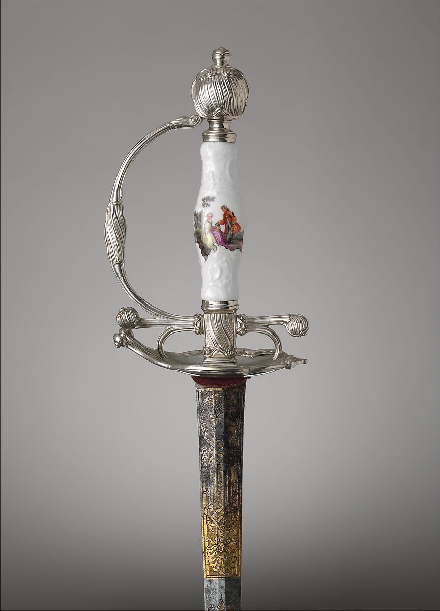 By the early seventeenth century, the rapier, a long slender thrusting sword, began to dominate as the gentleman’s weapon of choice. During the course of the century, however, as civilian fencing techniques became more specialized and refined, the rapier developed into a lighter, trimmed-down weapon known by about 1700 as the smallsword. Smallswords, often richly decorated, remained an integral part of a gentleman’s wardrobe until the wearing of swords in civilian settings went out of fashion at the end of the eighteenth century, at which time pistols were replacing swords as arms most frequently used in personal duels. The majority of smallsword hilts are made of silver or steel, but many also employ a wide variety of luxurious materials, such as gold, porcelain, and enamel. At their best, smallswords combine the crafts of swordsmith, cutler, and jeweler to create an elegant weapon that was also a wearable work of art.