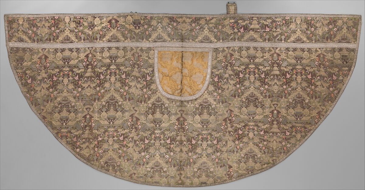 Although the use of fashionable textiles for ecclesiastical vestments certainly predates the eighteenth century, based on surviving vestments this practice appears to have accelerated after 1700. Eighteenth-century vestments made of dress silks are often attributed to France; the use here of the older Italian woven silk as the hood of this cope is an unusual variation on the practice.