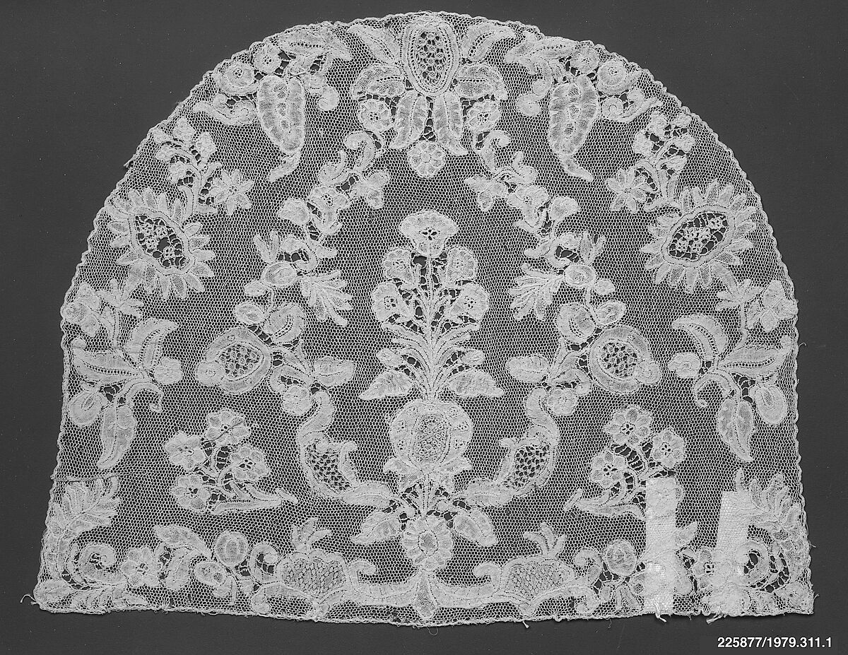 Among choice examples of the great lace types represented in Miss Newbold's small collection are: early Italian pieces combining cut-work, pulled work, reticella, embroidery on linen ground; Sicilian polychrome silk filet; seventeenthcentury Venetian points (point de Venise à reseau and the widely known rose point de Venise); famous French needlepoints (Point de Paris, Argentan, Alençon); French and Flemish bobbin laces (Binche, Valenciennes, Brussels, Point d'Angleterre, and Point de Gaz); and a beautiful cap crown of Argentella (1979.310.9), a rare eighteenth-century European lace whose place of origin has never been surely determined.