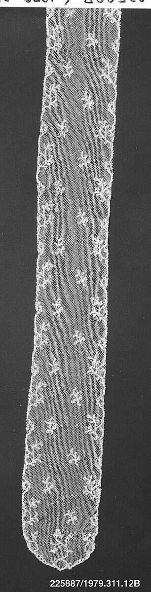 Among choice examples of the great lace types represented in Miss Newbold's small collection are: early Italian pieces combining cut-work, pulled work, reticella, embroidery on linen ground; Sicilian polychrome silk filet; seventeenthcentury Venetian points (point de Venise à reseau and the widely known rose point de Venise); famous French needlepoints (Point de Paris, Argentan, Alençon); French and Flemish bobbin laces (Binche, Valenciennes, Brussels, Point d'Angleterre, and Point de Gaz); and a beautiful cap crown of Argentella (1979.310.9), a rare eighteenth-century European lace whose place of origin has never been surely determined.