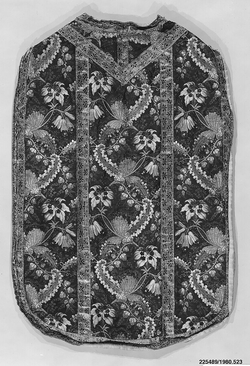 This tabard-like garment would have been worn as part of a set of liturgical vestments by a Roman Catholic priest whilst leading Christian church services. It is made out of a sturdy, mass-produced fabric created on a Jacquard loom, whose punch-card reading technology allowed complex patterns to be machine-woven, the pride of French technical innovation. Its pattern is boldly articulated with red and orange lilies against a forest-green background. The exaggerated tear-drop shape of its front is very typical of nineteenth-century taste.
