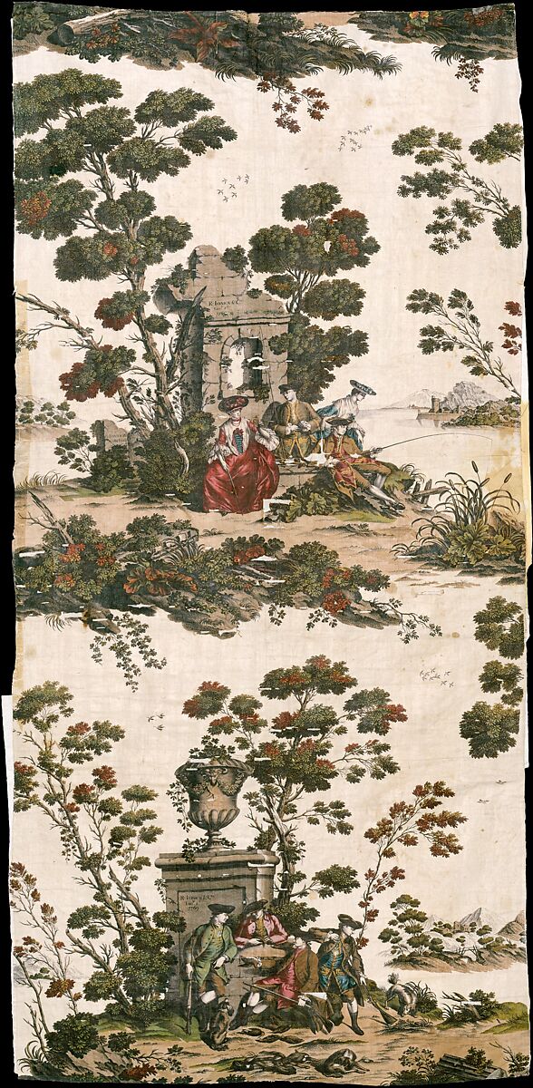 This furnishing fabric shows fashionably dressed ladies and gentlemen leisurely pursuing the pastimes of hunting and fishing; it represents, both aesthetically and technically, the height of English textile printing in the eighteenth century. By 1761 Robert Jones had established his manufactory at Old Ford in the East End of London and had mastered the secret of colorfast copperplate printing on textiles, a process invented nine years earlier by Francis Nixon of Drumcondra, Ireland. The new technique allowed for much larger repeats and finer modeling of forms than could be achieved with traditional wood-block printing. This compensated for the fact that the complexity of the design and the restrictions of copperplate printing required that only one color be used.