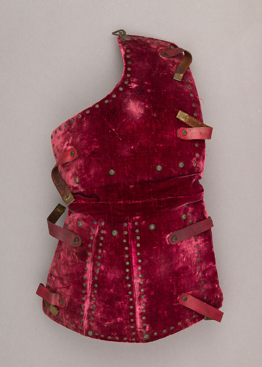 This is part of a large find of medieval armor discovered in 1840 in the ruins of the fortress of Chalcis, on the Greek island of Euboea (then a Venetian colony called Negroponte). The fortress had been captured and destroyed by the Turks in 1470. Now divided largely between the Ethnological Museum, Athens, and The Metropolitan Museum of Art, the Chalcis hoard contains many rare and unusual elements of fourteenth- and fifteenth-century armor. Of particular importance are the variety of headpieces and the many fragments of brigandines (armor for the torso constructed of small plates riveted to layers of fabric), some of which retain portions of their original velvet covering. The Chalcis armor provides a unique picture of the armament used in the Aegean, one of the easternmost military outposts of the Venetian empire.