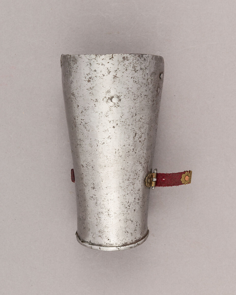 This armor is made up of genuine, restored, and modern pieces that were assembled in the early 20th century. A few of its parts (the defenses for the forearms, possibly the right thigh, and the left shin) come from a large find of medieval armor discovered in 1840 in the ruins of the fortress of Chalcis, on the Greek island of Euboea (then a Venetian colony called Negroponte). The fortress had been captured and destroyed by the Turks in 1470. Now divided largely between the Ethnological Museum, Athens, and The Metropolitan Museum of Art, the Chalcis hoard contains many rare and unusual elements of fourteenth- and fifteenth-century armor. Of particular importance are the variety of headpieces and the many fragments of brigandines (armor for the torso constructed of small plates riveted to layers of fabric), some of which retain portions of their original velvet covering. The Chalcis armor provides a unique picture of the armament used in the Aegean, one of the easternmost military outposts of the Venetian empire.