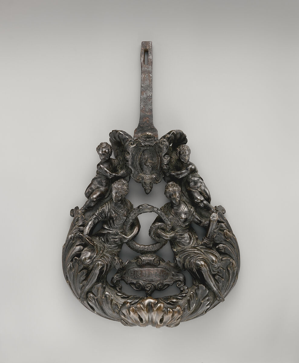 The Latin inscription in the strapwork cartouche beneath the self-devouring serpent reads HIS DVCIR, a likely abbreviation of HIS DUCIBUS, that is, “with these generals.” This might be a citation of Livy’s Ab Urbe Condita (24:44), which furnishes an additional Roman context of political and martial leadership on top of the cardinal virtues’ moral guidance.[3] The message would be particularly resonant in Venice, a city that embraced the ideals of romanitas.[4] Given the bronze’s themes of virtue and governance, it is possible that this sophisticated piece of statecraft was installed on the door of the palazzo of a Venetian patrician. Certainly, the sheer weight of the Thaw doorknocker suggests a well-to-do client, as bronze was by no means a cheap material. To the owner and all passersby, this pendulous bronze serves as a reminder of the moral principles that guarantee perpetual peace.