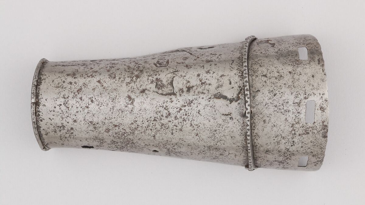 This is part of a large find of medieval armor discovered in 1840 in the ruins of the fortress of Chalcis, on the Greek island of Euboea (then a Venetian colony called Negroponte). The fortress had been captured and destroyed by the Turks in 1470. Now divided largely between the Ethnological Museum, Athens, and The Metropolitan Museum of Art, the Chalcis hoard contains many rare and unusual elements of fourteenth- and fifteenth-century armor. Of particular importance are the variety of headpieces and the many fragments of brigandines (armor for the torso constructed of small plates riveted to layers of fabric), some of which retain portions of their original velvet covering. The Chalcis armor provides a unique picture of the armament used in the Aegean, one of the easternmost military outposts of the Venetian empire.