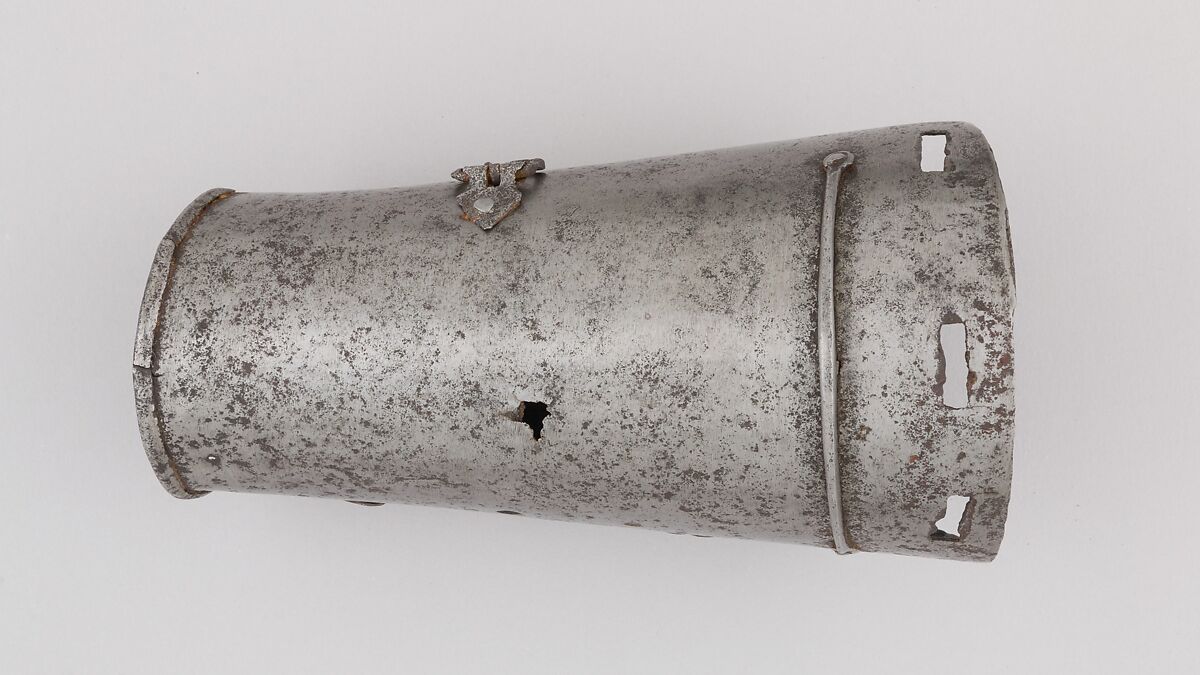 This is part of a large find of medieval armor discovered in 1840 in the ruins of the fortress of Chalcis, on the Greek island of Euboea (then a Venetian colony called Negroponte). The fortress had been captured and destroyed by the Turks in 1470. Now divided largely between the Ethnological Museum, Athens, and The Metropolitan Museum of Art, the Chalcis hoard contains many rare and unusual elements of fourteenth- and fifteenth-century armor. Of particular importance are the variety of headpieces and the many fragments of brigandines (armor for the torso constructed of small plates riveted to layers of fabric), some of which retain portions of their original velvet covering. The Chalcis armor provides a unique picture of the armament used in the Aegean, one of the easternmost military outposts of the Venetian empire.